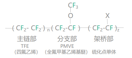 ● 全氟醚FFKM的構(gòu)造,是由主鏈部: TFE (四氟乙烯), 分支部: PMVE (全氟甲基乙烯基醚)及架橋部所構(gòu)成。